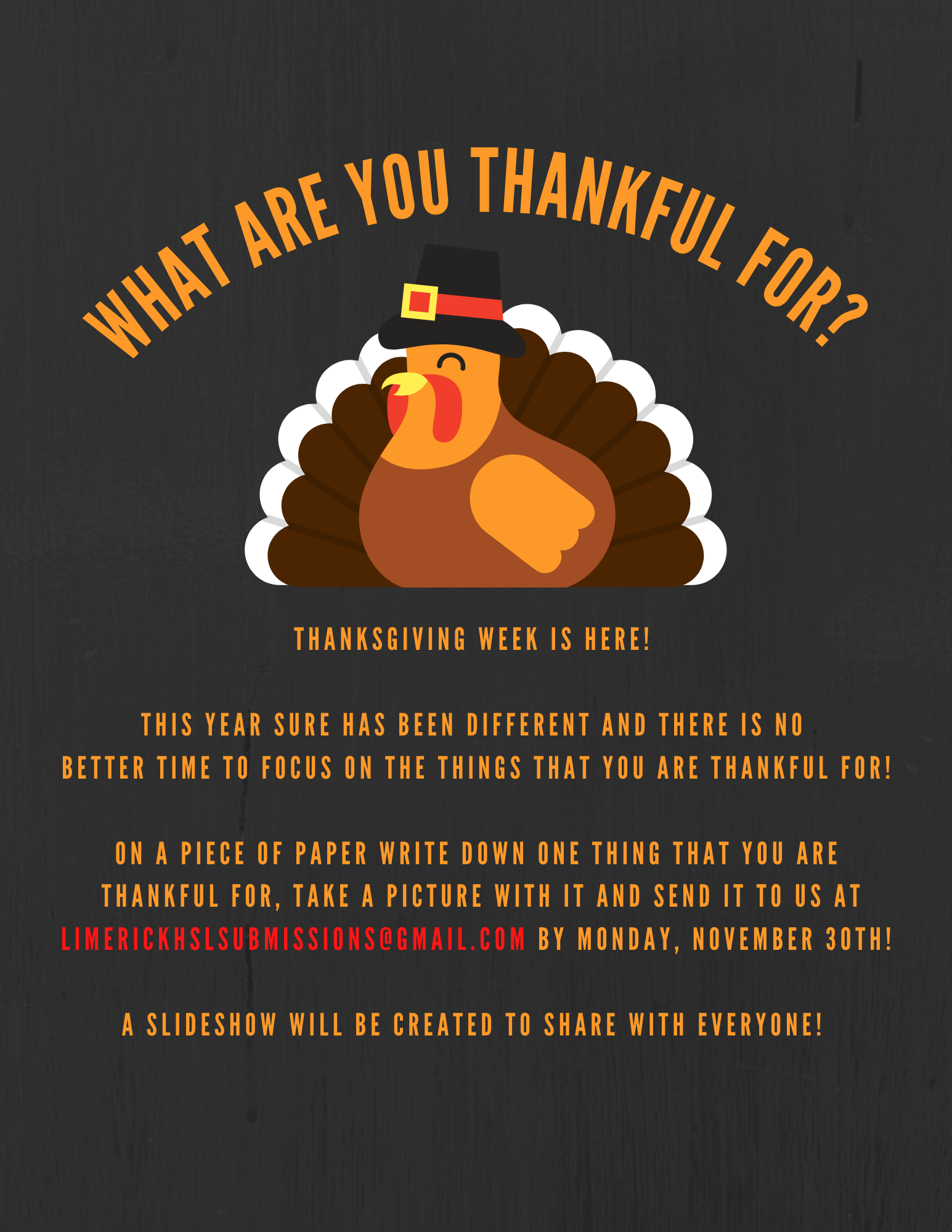 On a piece of paper write down one thing that you are thankful for, take a picture with it and send it to us at limerickhslsubmissions@gmail.com by Monday, November 30th!