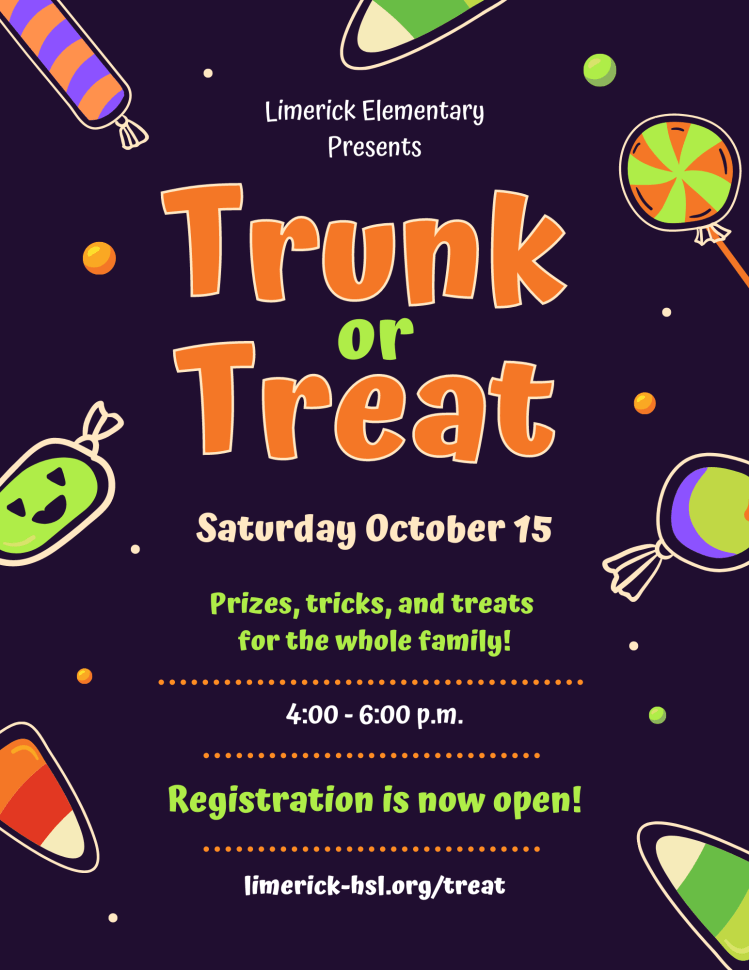 For the first time ever, please join the Limerick Elementary community in celebrating the Halloween season at its very own Trunk or Treat event on Saturday, October 15. Whether you’re ready to put on a dazzling display or just grab some pre-Halloween loot (maybe even a little of both!), join us in the Limerick Elementary School parking lot (playground side) between 4:00 and 6:00 p.m. for some solid family fun. This event is only open to current LES students and their families.