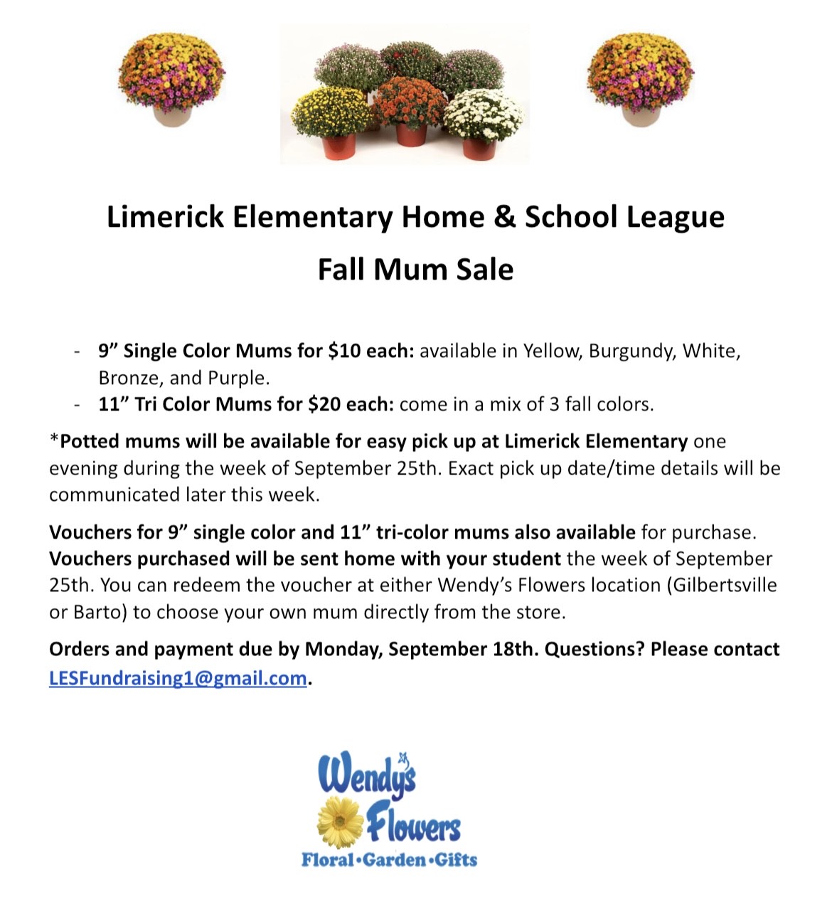 We’re kicking off the school year with a fundraiser to help you with your fall decorating needs! We’ve partnered with Wendy’s Flowers to sell mums or vouchers for mums. Options available include 9″ single color mums in yellow, burgundy, white, bronze or purple ($10 each) or 11″ tri-color mums which will be a mix of 3 fall colors ($20 each). Mums will be available for pick up at Limerick Elementary the week of September 25th – exact pick up date/time details will be communicated later this week. Or, you can choose to purchase vouchers for the 9″ or 11″ mum options, which you can then take to either Wendy’s Flowers location (Gilbertsville or Barto) to select mums from the store at your convenience. Vouchers purchased will be sent home with your students during the week of September 25th. Orders can be placed using this link. Questions? Please contact LESFundraising1@gmail.com.